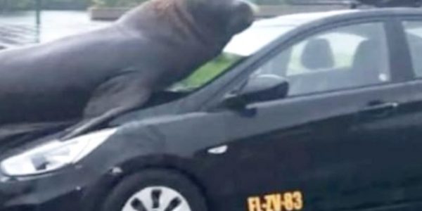 Captan a un lobo marino «descansando» sobre el capó de un colectivo en costanera de Valdivia