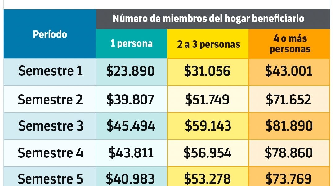 Como se aprecia en la tabla, independiente de la cantidad de miembros de la familia beneficiaria, su monto incrementará a medida que transcurren los cinco semestres en que estará vigente, periodo contemplado desde el segundo semestre de 2024 al segundo de 2026.