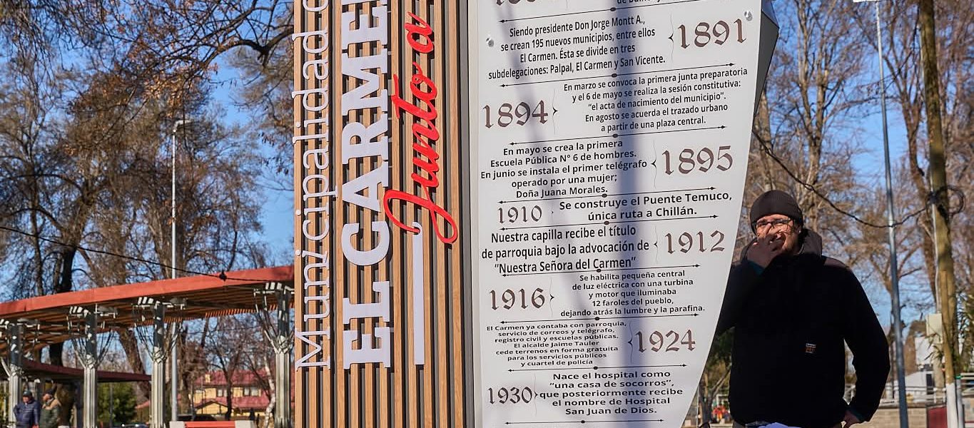 En el marco de las actividades del 172° aniversario de nuestra comuna, este viernes inauguramos en la Plaza de Armas de El Carmen, el «Monumento a la Línea de Tiempo» de la comuna, destacando algunos de los principales hitos terminaron por dar forma e identidad a la comuna carmelina.