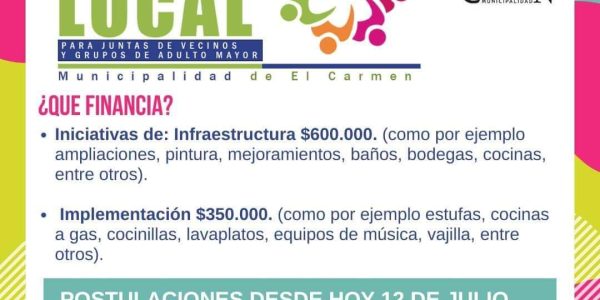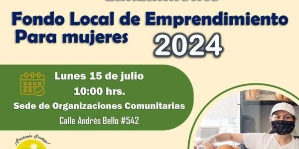 Nuestro municipio invita cordialmente a todas las mujeres que tienen un emprendimiento de cualquier tipo, que estén o no formalizadas, al lanzamiento de este exitoso fondo, creado por nuestro municipio, pensando en todas las mujeres emprendedoras de nuestra comuna. Todas invitadas…
